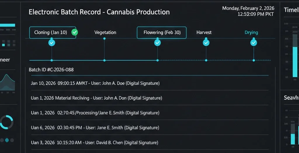 Electronic batch record timeline showing cannabis production events for audit and recall readiness